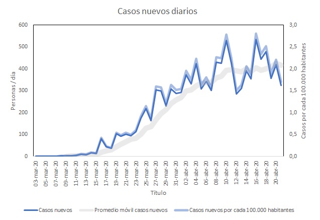 El número diario de casos nuevos ha ido creciendo, y esta es la causa de la acceleración del crecimiento de los casos totales: practicamente todos los días, el número adicional de nuevos casos es mayor que el respectivo día previo. Aún así, desde la primera semana de abril, el promedio móvil sobre 7 días ha crecido cada vez menos, dando una forma de “S”. Si esto se mantiene, significa que cada día se agregará aproximadamente un número constante de nuevos casos confirmados a los casos confirmados totales, lo que equivale a un crecimiento lineal de los casos confirmados totales (ver la línea roja en el gráfico previo):