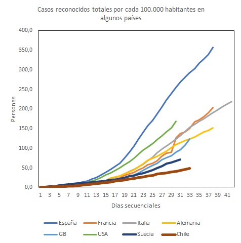 Lo otro: estos son los “casos conocidos”, en base a las personas que han llego a los hospitales y las personas que, al sentir síntomas, solicitan hacer el “test” y se les hace el test (lo que no es siempre el caso). Ya que debe haber personas con síntomas que no intentan hacer el test, y personas que son rechazadas al solicitar someterse al test, se debe concluir que hay un número creciente de personas que son “casos”, pero no “conocidos” (o “re-conocidos”) por el sistema de salud. Más sobre esto en la página con el modelo de simulación.