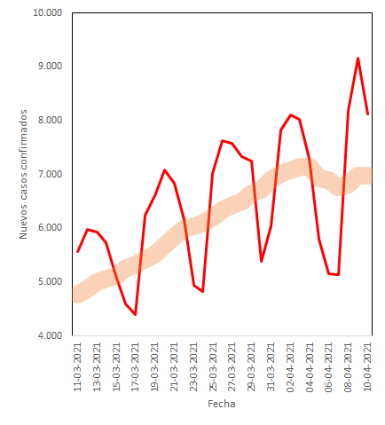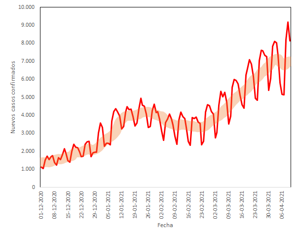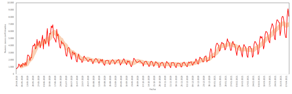 Desde abril 2020 a abril 2021, hemos pasado por dos “olas” y ahora estamos en la tercera. La montaña rusa semanal causada por el procesoamento PCR y sus registros no tiene significancia para el comportamento de la pandemia en Chile. Y al privilegiar los datos de cada día por sobre el comportamiento a lo largo del tiempo, se genera un estacato de “¡está empeorando! – ¡está mejorando!” innecesario, como lo muestra el siguiente gráfico.