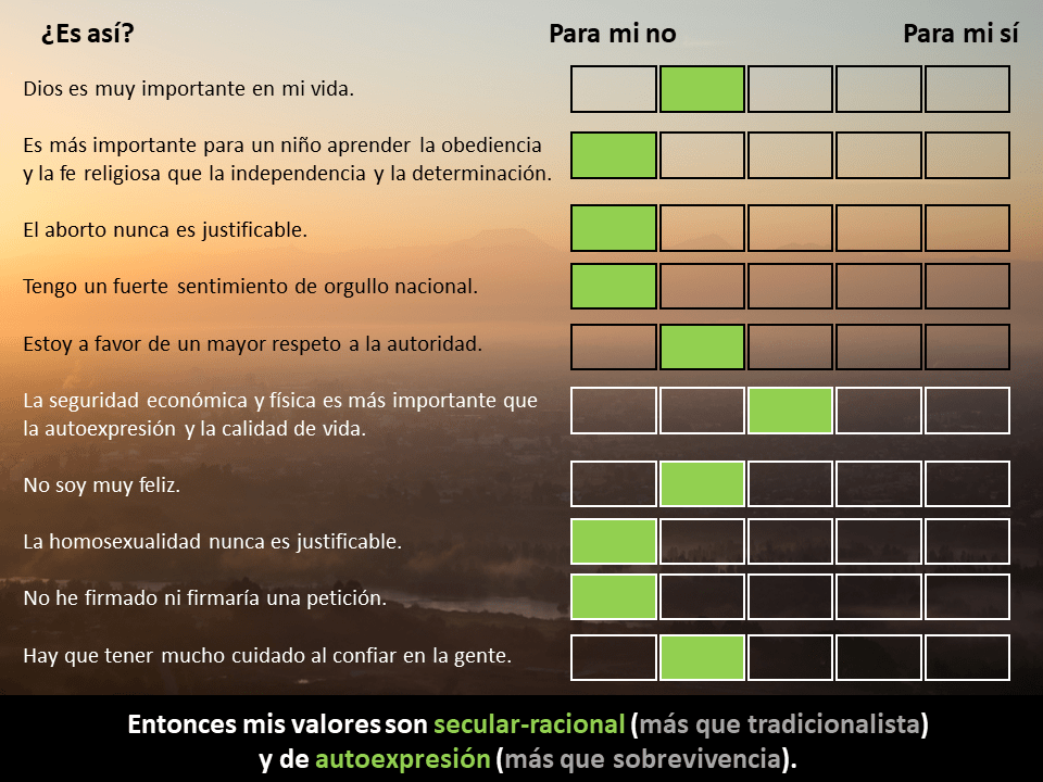 Obviamente, la mayoría de las personas no son totalmente tradicionalista o totalmente secular-racional. Tampoco son 100% de supervivencia o de auto-expresión. Se ha visto que el grado de acuerdo o desacuerdo con las siguientes afirmaciones permite categorizar a las personas (más información aquí).